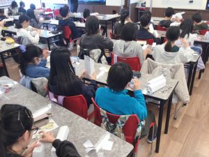 今回の理科実験では、一人ひとりが紙をはさみでちょきちょき。